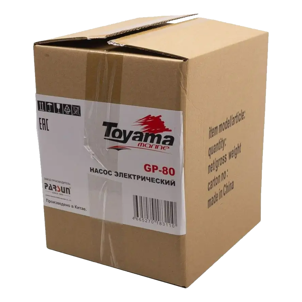 Максимальный потребляемый ток – 20 А, а максимальная производительность – 500 л/мин. При этом допустимое время непрерывной работы достигает 15 минут. Внутренние детали насоса Toyama GP-80 выполнены из стали, обеспечивающей надежное и долговечное функционирование оборудования. Благодаря корпусу из прочного пластика изделие имеет небольшой вес – 2,6 кг.