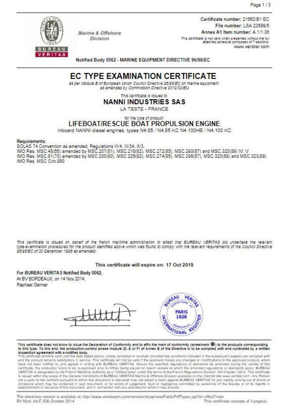 CERTIFICAT TYPE APPROVAL SOLAS Nanni N4.85