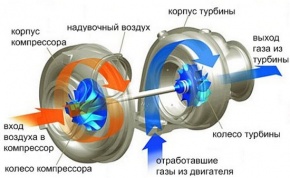 Если рассматривать сам принцип действия данного вида нагнетания воздушного потока, то в общих чертах схема выглядит так: колесо турбины, вращающееся за счет выхлопных газов, приводит в движение компрессорное колесо, которое и отвечает за сжатие и нагнетание воздушных масс в камеру сгорания.
