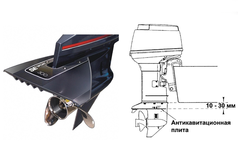 Не допускать кавитацию помогает антикавитационная плита под винтом. Но при высокой установке мотора она не работает! Её место на 5-25 мм ниже днища.